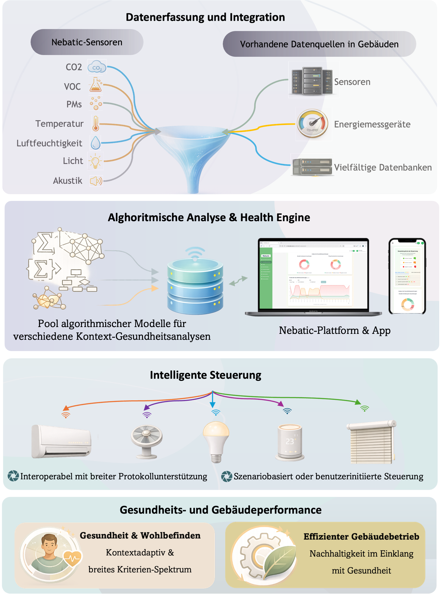 Nebatic legt einen klaren Schwerpunkt auf die Förderung von Gesundheit und Wohlbefinden. Es analysiert Umgebungsfaktoren anhand eines mehrschichtigen Modells, das körperliche Gesundheit, psychische Gesundheit und Leistungsfähigkeit umfasst. Jede dieser Dimensionen wird anhand spezifischer Unterkriterien präzise bewertet. Messdaten zu Luftqualität, Licht und Akustik werden systematisch mit den entsprechenden Gesundheitsindikatoren verknüpft, sodass Belastungen, Risiken und Optimierungspotenziale klar erkennbar werden. Darüber hinaus erfolgen die Analysen durch rechnergestützte Modelle, die für verschiedene Raumtypen wie Büro, Schlafzimmer und so weiter spezifiziert sind.